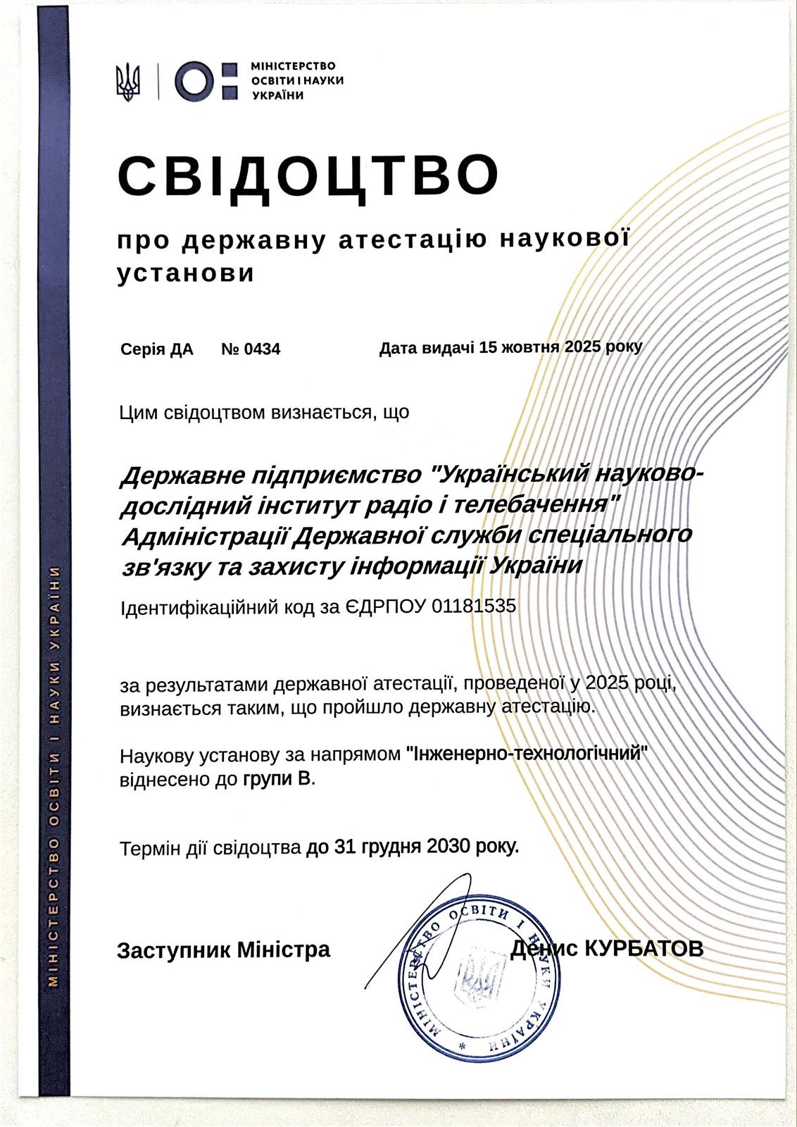 Постановою Кабінету Міністрів України від 4 березня 2015 р. № 83 Державне підприємство «Український науково-дослідний інститут радіо і телебачення» внесено до Переліку об’єктів державної власності, що мають стратегічне значення для економіки і безпеки держави. Зважаючи на державну важливість наукових проблем, які вирішують науковці ДП «УНДІРТ», підприємство виконує функції системного інституту з питань радіозв’язку, телебачення і радіомовлення за такими основними напрямками діяльності: